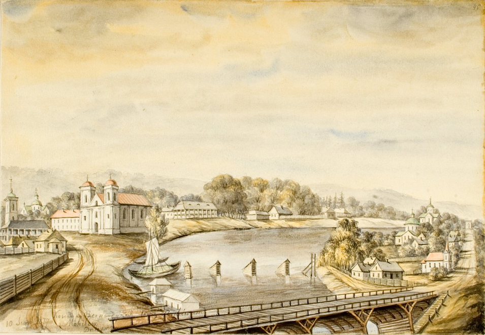 Гравюра Наполеона Орды изображен пригород Могилева и костел Святого Антония в XIX веке