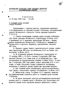 В рамках рубрики «Музейные тайны » учреждение «Государственный архив Могилевской области» представляет для ознакомления копию решения исполнительного комитета Могилевского городского Совета народных депутатов «О создании музея истории города Могилева» от 16 июля 1990 года № 4-34.