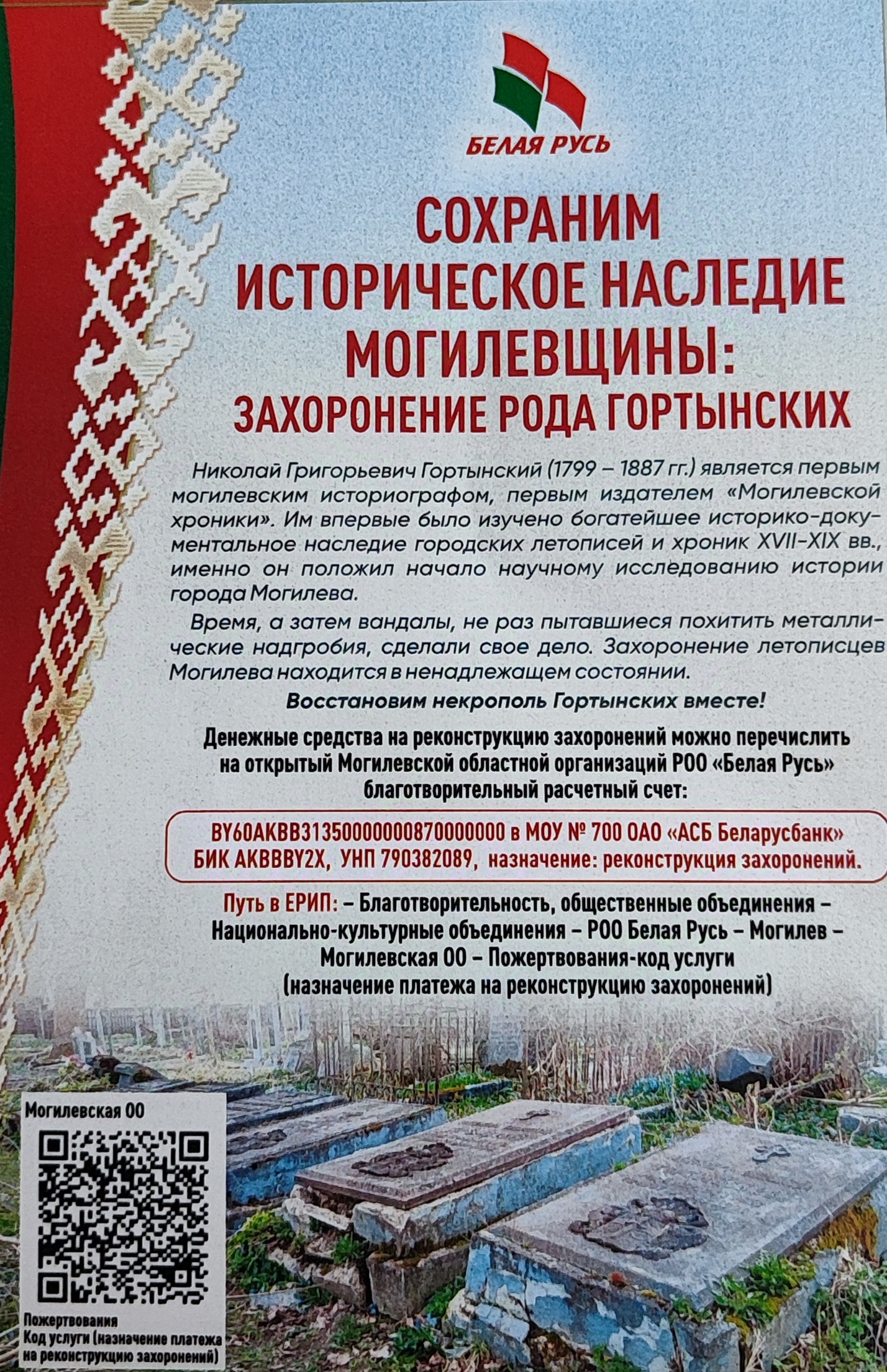 Усе жадаючыя прыняць удзел і ўнесці свой уклад у аднаўленне месцаў пахаванняў людзей якія ўнеслі значны ўклад у развіццё нашага горада, могуць апынуцца дапамогу па рэквізітах ніжэй.